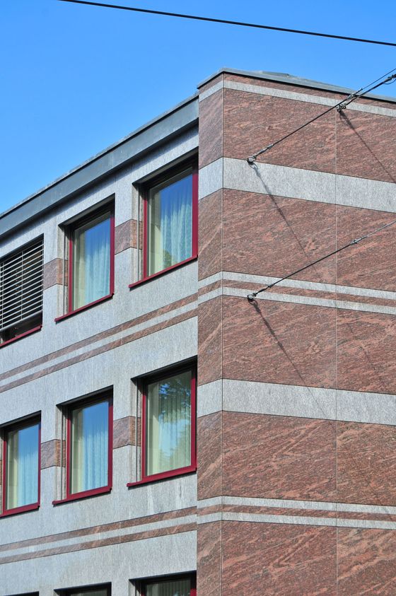Zeitlos ästhetisch und wertig: Fassaden aus Naturstein. Ausführungen mit vorgehängten Platten, gerne grossformatig, oder als Sichtmauerwerk.