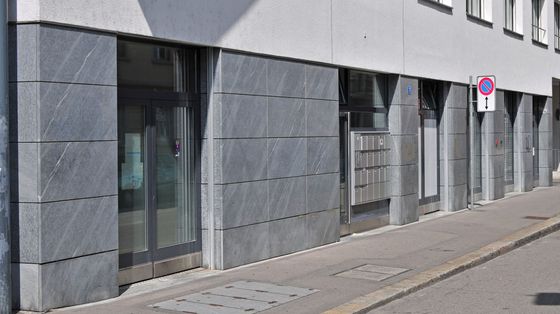 Sockel und Sockelgeschosse in Naturstein sind stilvolle Ergänzungen zu Stahl- und Glaskonstruktionen – und bilden einen attraktiven Zugang zur Verkaufsfläche.